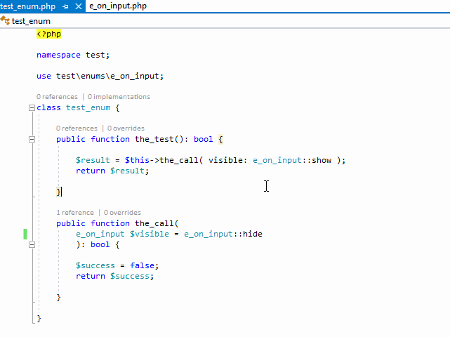 The enums are declared in separate code files within my own application. The issue is endemic across multiple PHP projects using PHP Tools. I get no response after entering the double colon of any enum. Some sample code from my current (WordPress plugin) project is shown below: