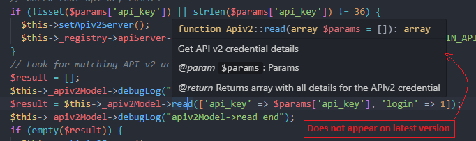 In the above sample $this->_m2mModel has the type M2m and the read() function hover will display the correct information but as soon as the the line $this->_m2mModel = $this->_registry->container->get('app.M2m'); is added above it which fetches its instance, the function read() looses its reference and VSCode displays nothing on hover and does not pick it up using "Find All References".
