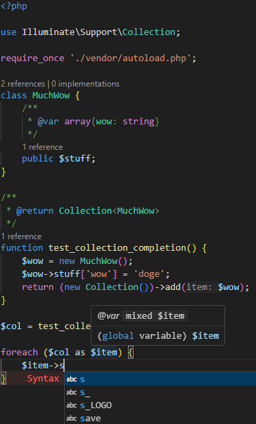 Obviously, there are workarounds, either changing the return to /** @return Collection|MuchWow[] */ or manually adding /** @var MuchWow $item */