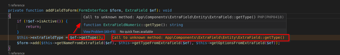 Hello. I am seeing "Unknown method" $ef->getType() warning, but however, that method is browserable by clicking in it and can see the method tip as you can see in the image.