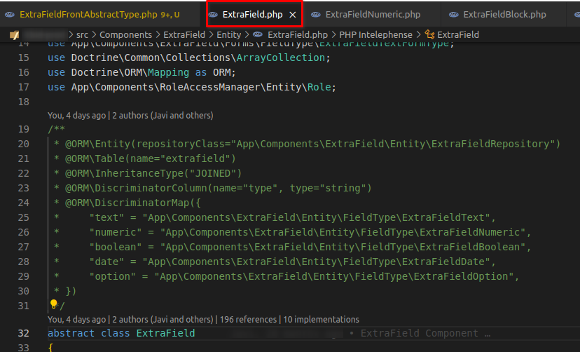 And as shown below, this is the target entity ExtraField which has the method getType() in the entities appearing in the @ORM\DiscriminatorMap.