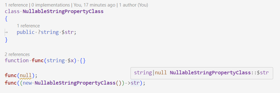 Nico I use native types, but it seems the problem does exist for phpDoc too. Extension version is v1.48.15635 When using null as argument, the error PHP0406 is showing. When using the nullable of the new object, no error is showing.