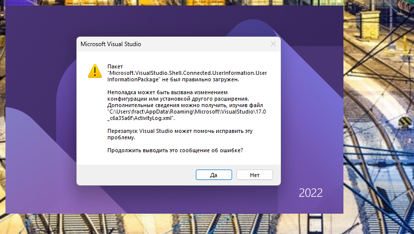 Dear technical support worker and simply good developers, I, alas, have nothing to do with working with PHP, but I ask you, if possible, to help me understand the error that pops up when starting Visual Studio 2022 (the studio closes a few seconds after launch, displaying error), the inscription is:"Microsoft.VisualStudio.Shell.Connected.Userinformation.UserinformationPackage" was loaded incorrectly. The problem may be caused by a configuration change or installation of a different extension C:\Users\fract\AppData\Roaming\Microsoft\VisualStudio\17.0_55e2d9da. "