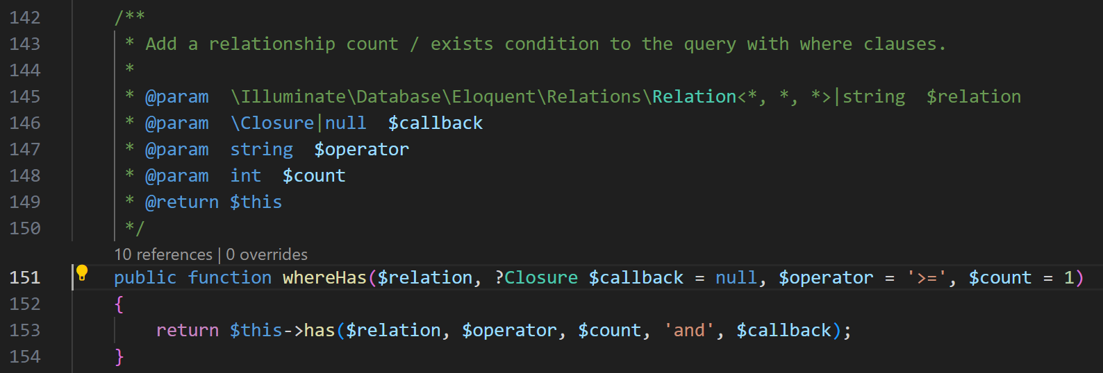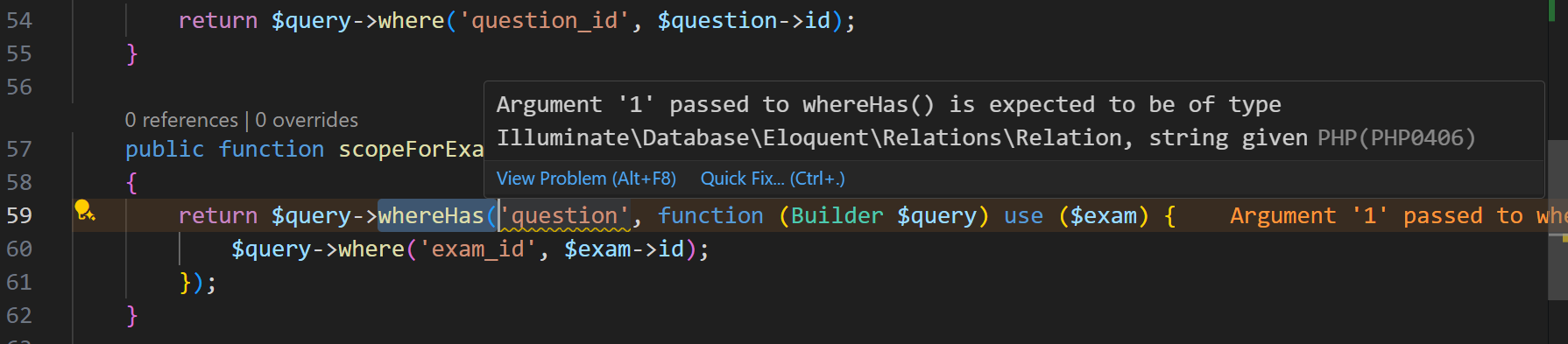 I edited the phpDoc from @param \Illuminate\Database\Eloquent\Relations\Relation<*, *, *>|string $relation to @param \Illuminate\Database\Eloquent\Relations\Relation|string $relation, then cleared the cache > Clear /vendor/ cache. and then the error disappears :)