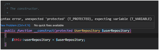 willslade Using php 8.3 you can now use constructors to define protected properties https://www.php.net/manual/en/language.oop5.decon.php#language.oop5.decon.constructor.promotion instead of defining them and assigning them in construct, however the PHP tool is flagging this as an error: