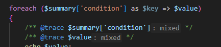 JakubMisek thirdpartycook Thank you for reporting the issue. The editor "misbehaves" on foreach ($summary['condition'], and won't infer the type of $value. We'll fix this case within the next update!