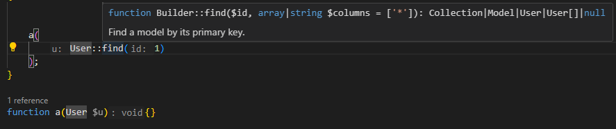 Model::find($id); // If type of ['id'] is unknown it will say its a collection.