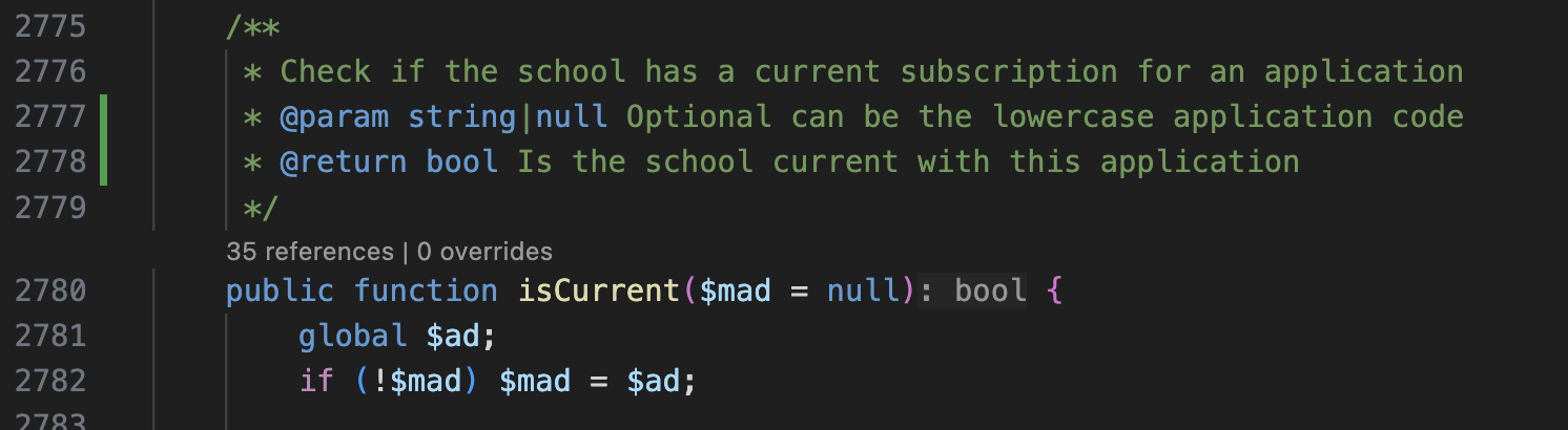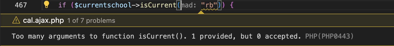 JakubMisek MurrayCollingwood, thank you for reporting the issue. Is the type of $currentSchool correct? (if you mouse-hover over it) Do you get the correct function if you mouse-hover over isCurrent ?