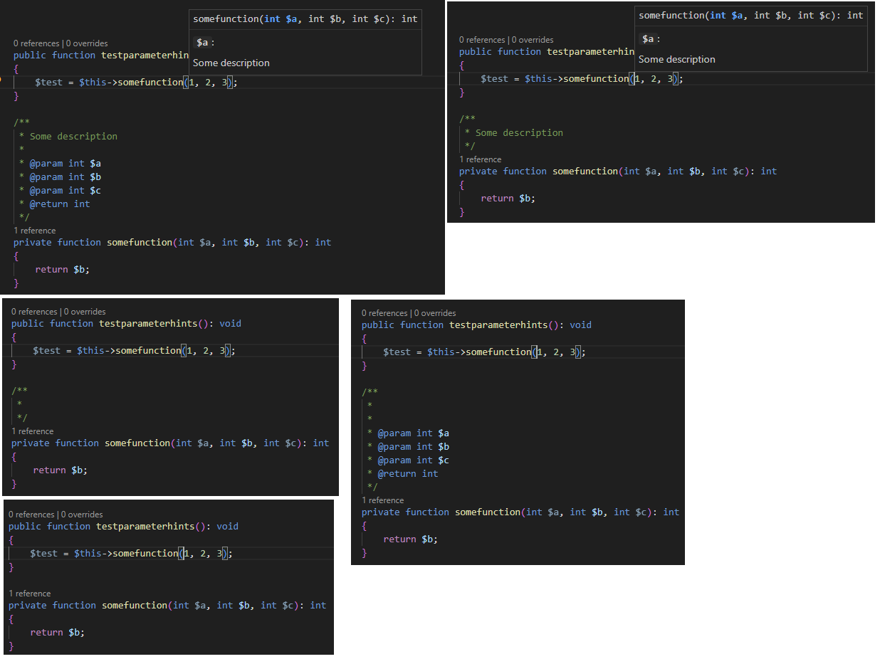 Hi, I also have the same issue. It happens for user defined functions that don't have phpdoc information, and php native functions that have multiple definitions (I think because I have phpstan.phar and phpunit.phar in the root of one of my projects, the function signatures get parsed, but maybe also polymorphic functions are like that).