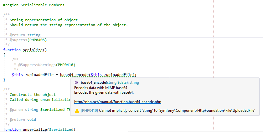 PHPDoc tag @suppress or @SuppressWarnings make sense. Do you know what is the standard approach by other editors?