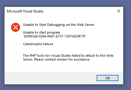Suddenly getting this error when trying to debug a PHP application. Just started mid-session. After clicking OK, the project unloads.