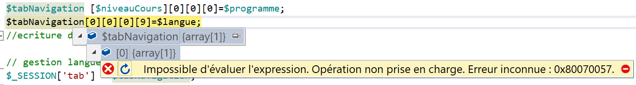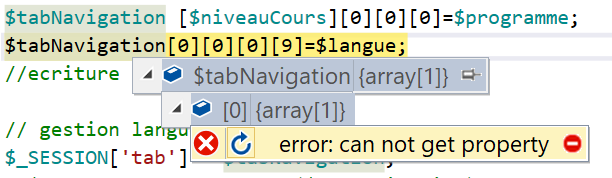 BernardRotteleur When I use php tools debug mode, when I have a array, php tool give me: $tab{array[1]} [0]{array[1]} error : can not get property Impossible d'évaluer l'expression. Opération non prise en charge. Erreur inconnue : 0x80070057 It's a problem php tools