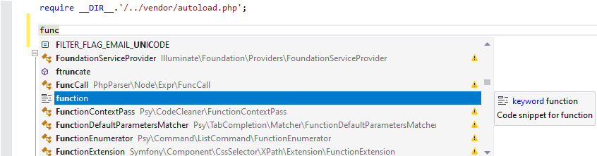 JakubMisek Hi, What we've tested, the snippets are there (e.g. a "function" snippet, completed with Tab, Tab): Custom snippets can be added as described at https://docs.microsoft.com/en-us/visualstudio/ide/code-snippets?view=vs-2022 I hope it helps. Please let me know if there are snippets in your .php code. Thank you.