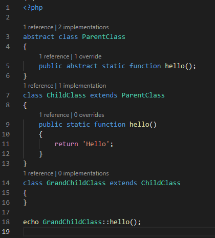 The code runs fine, and as far as I know is valid. IntelliSense even suggests the hello method on GrandChildClass, but we get error PHP2414 - "Class GrandChildClass does not implement abstract methods: public function hello()".