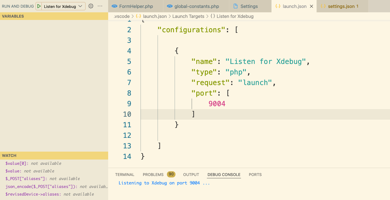 A popup directs me to launch.json. I think 9000 isn't available on my server because of FPM and I'd like to switch to a different port like 9004. Despite what I try, the unit test bug icon button seems set on using port 9000. How can I switch the bug icon button to use a different port?