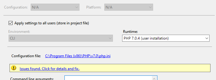 I see, that will be reason. Our default installation is in IIS Express folder. For this reason it keeps telling you "Your environment is missing". You can either switch to Custom server in project properties, or install PHP for IIS Express through Web Platform Installer.