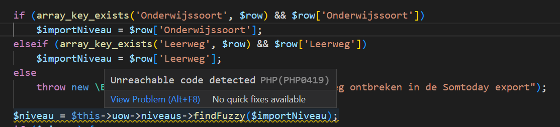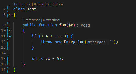 Hello. I've got an example of something very similar. Im using DevSense v1.45.15192 inside a Docker container using php:7.4-fpm, with DevContainers v0.348, running VSCode (v1.87), on a ubuntu 22.04 machine. My code snippet is very simple: