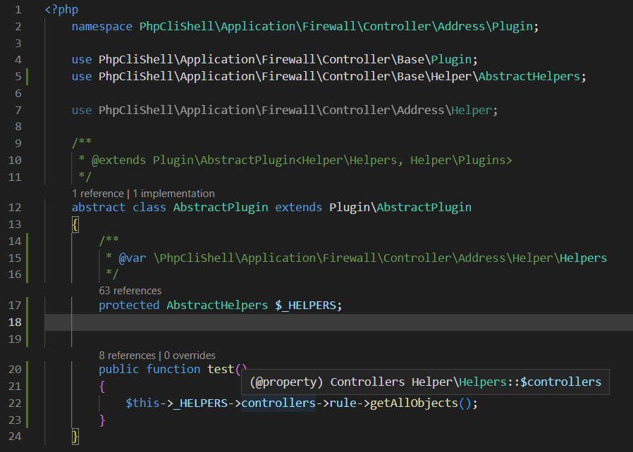 $helper->plugin->test->myPropertyA->myPropertyA->myPropertyA;