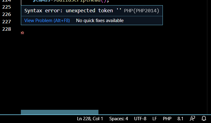 Just installed this extension to test it out to see if it might work for me. In many php files that I open, I am getting a syntax error on the last line/character of the file whereby the error registered in VS Code's "Problems" section states: Syntax error: unexpected token ''