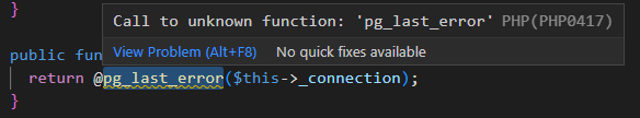 pg_last_error() is a part of "pgsql" extension, which is not enabled by default. Please add the following to your settings: