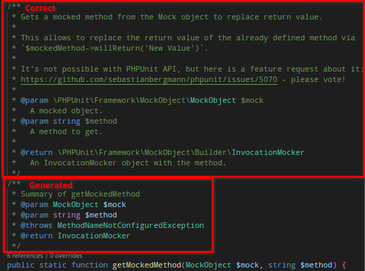JakubMisek it's about phpdoc generation (and/or code formatting?) type names should be FQN (although we work ok with shortened names) parameters and return summary on the next line